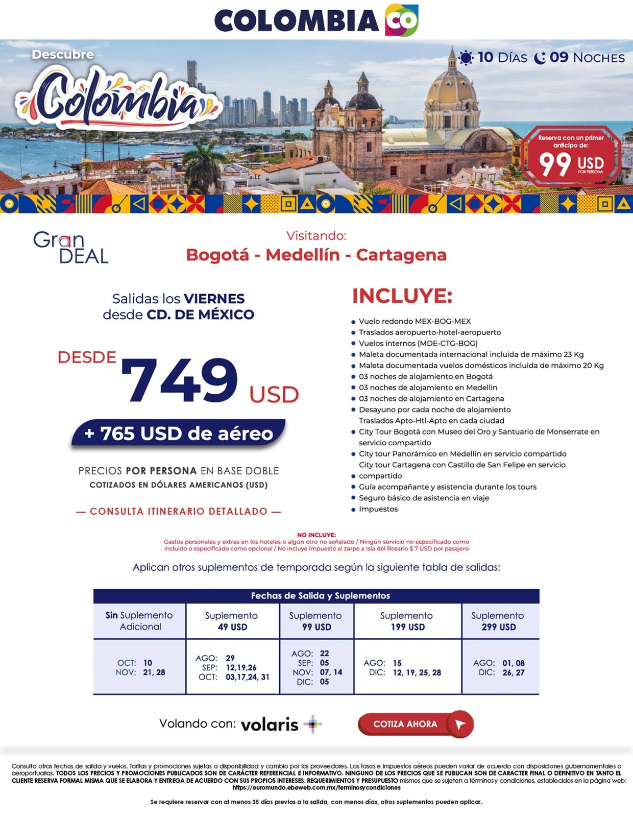 Conozca Colombia con este paquete de 10 días, 9 noches, que incluye el vuelo redondo desde la Ciudad de México con Volaris, hospedaje con desayuno y un city tour por cada una de las ciudades visitadas: Bogotá, Medellín y Cartagena.